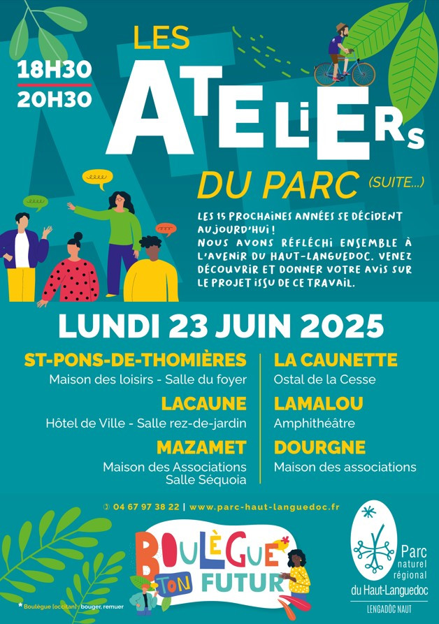 Nous avons organisé 5 Ateliers du Parc : le 5 octobre à Courniou, le 12 octobre au Bousquet-d’Orb, le 7 novembre à Lacaune, le 9 novembre à Mons-la-Trivalle et le 15 novembre à Labruguière. Ces 5 soirées vous ont permis de débattre et de décider ensemble des actions à mettre en œuvre sur le territoire afin de construire un avenir plus responsable dans le Haut-Languedoc.