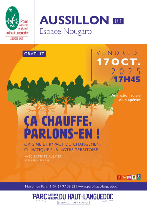 Le Parc propose à Aussillon la conférence « changement climatique, origine et impact sur notre territoire», vendredi 17 octobre 2025 à 17h45 à l'Espace Nougaro, par Baptiste Algayer, docteur en Sciences de la Terre.